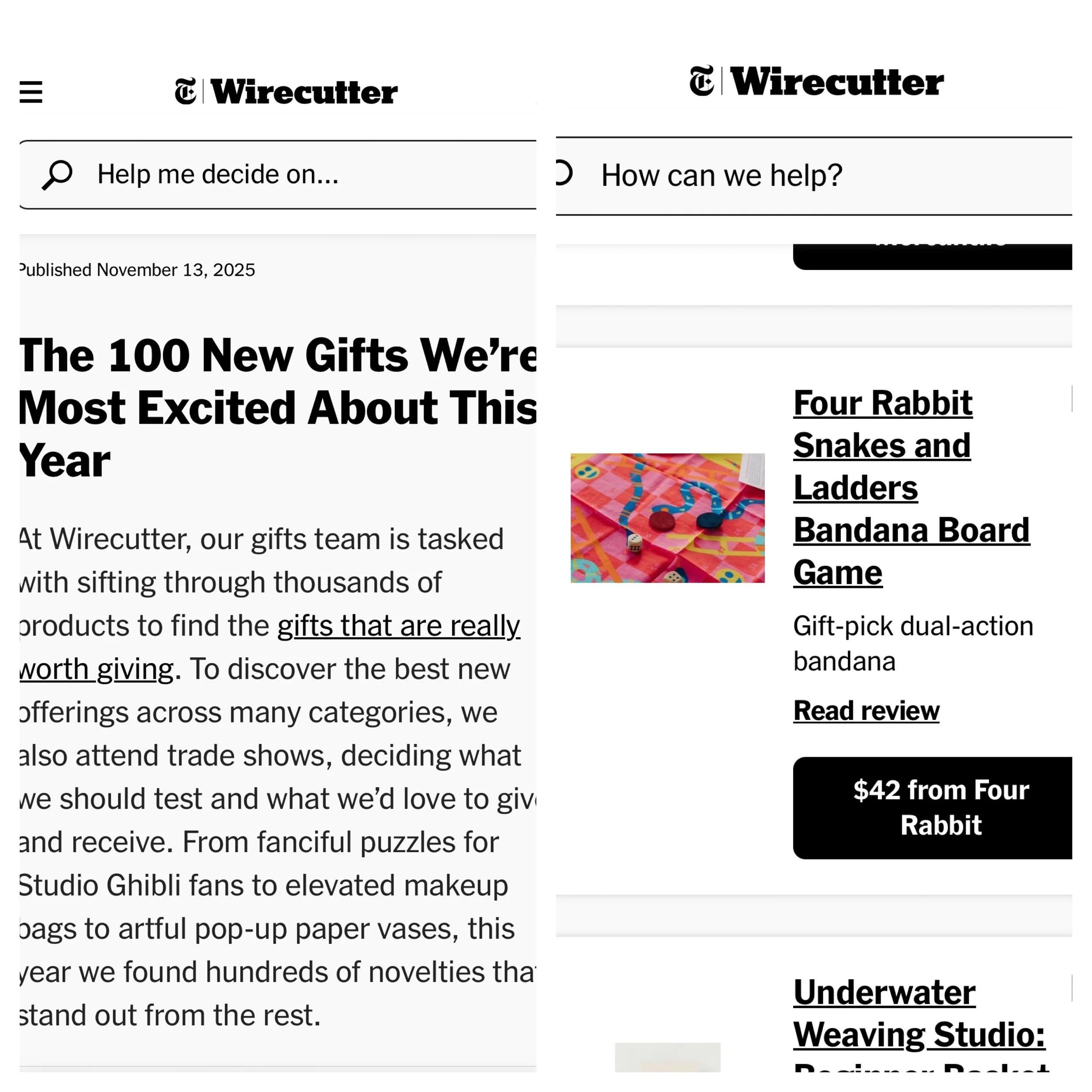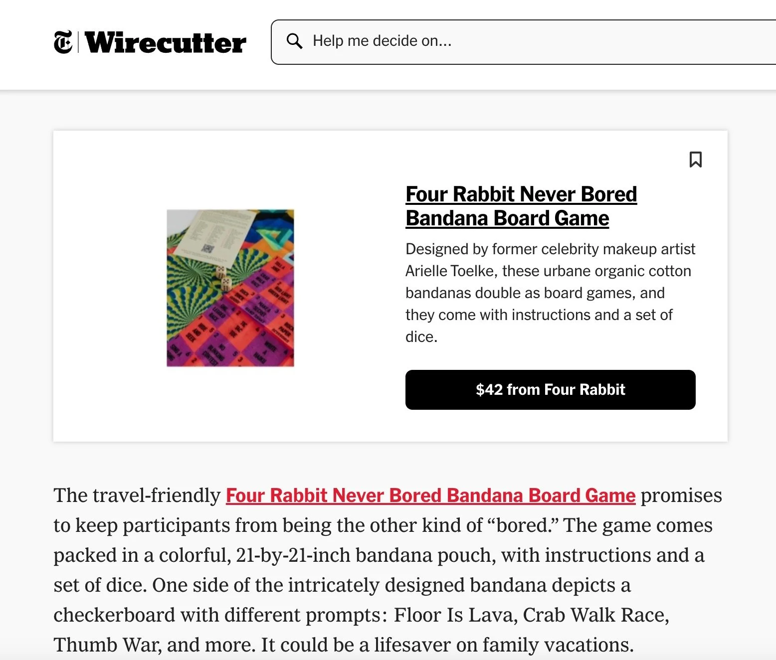 WOW we cant believe it! We have made it into so many gift guides this year. Its a dream come true to be in the New York Times Holiday Gift Guide along with TWO! Wirecutter gift guides, 100 gifts we are excited about this year (Snakes and Ladders Bandana Board Game) and Gifts for people who have everything (Never Bored Bandana Board Game). We are also on the Locavores Shop Local Gift Guide and a Sustainable Gifts Gift Guide. WOW WOW!