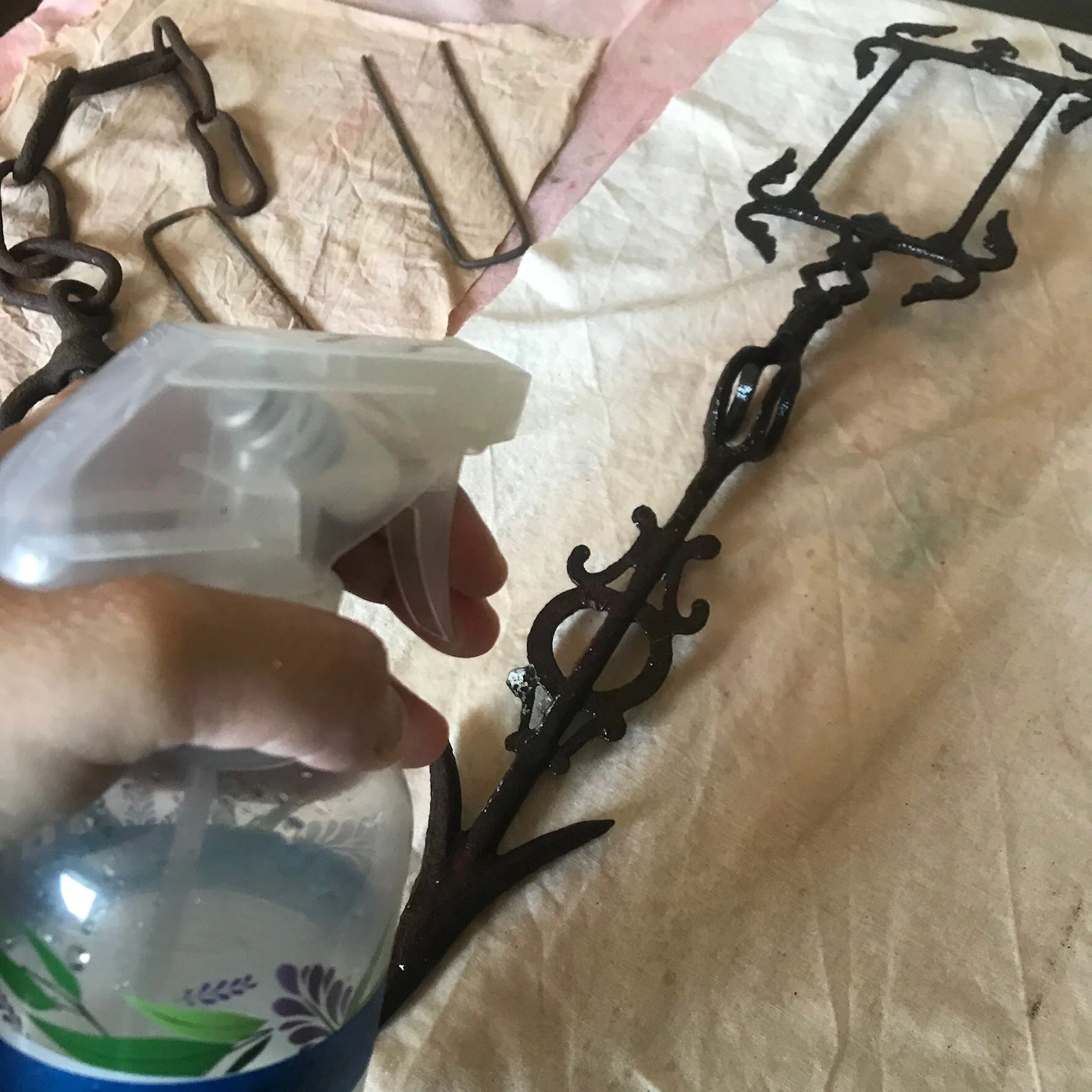 Once your objects are on the fabric, generously spray the fabric and the rusty objects with a 50/50 solution of vinegar and water.