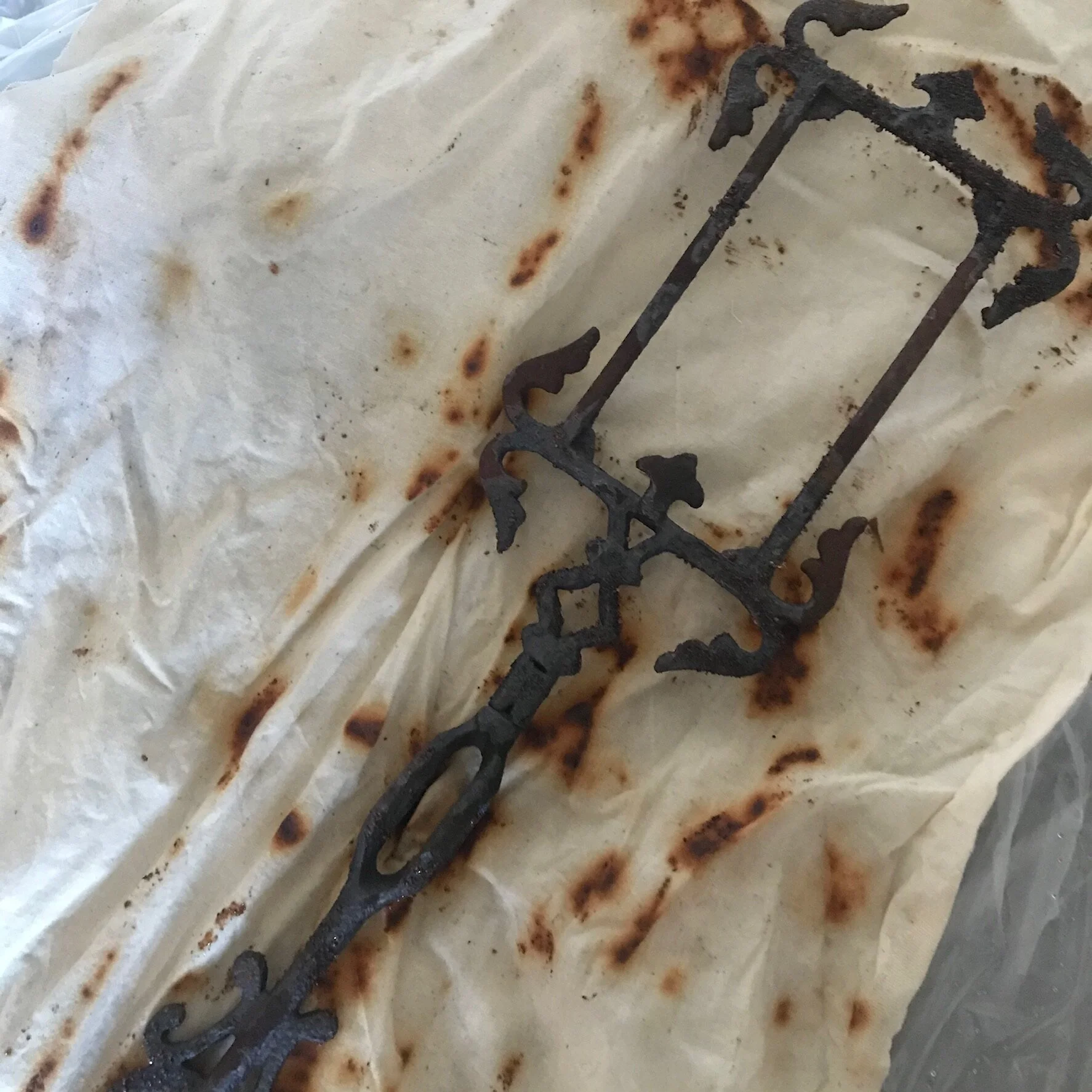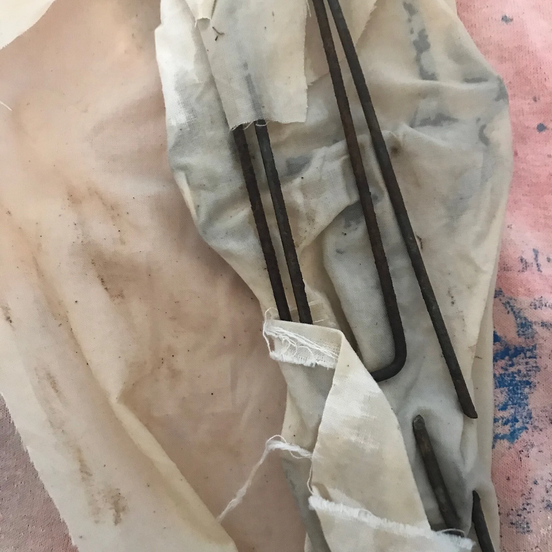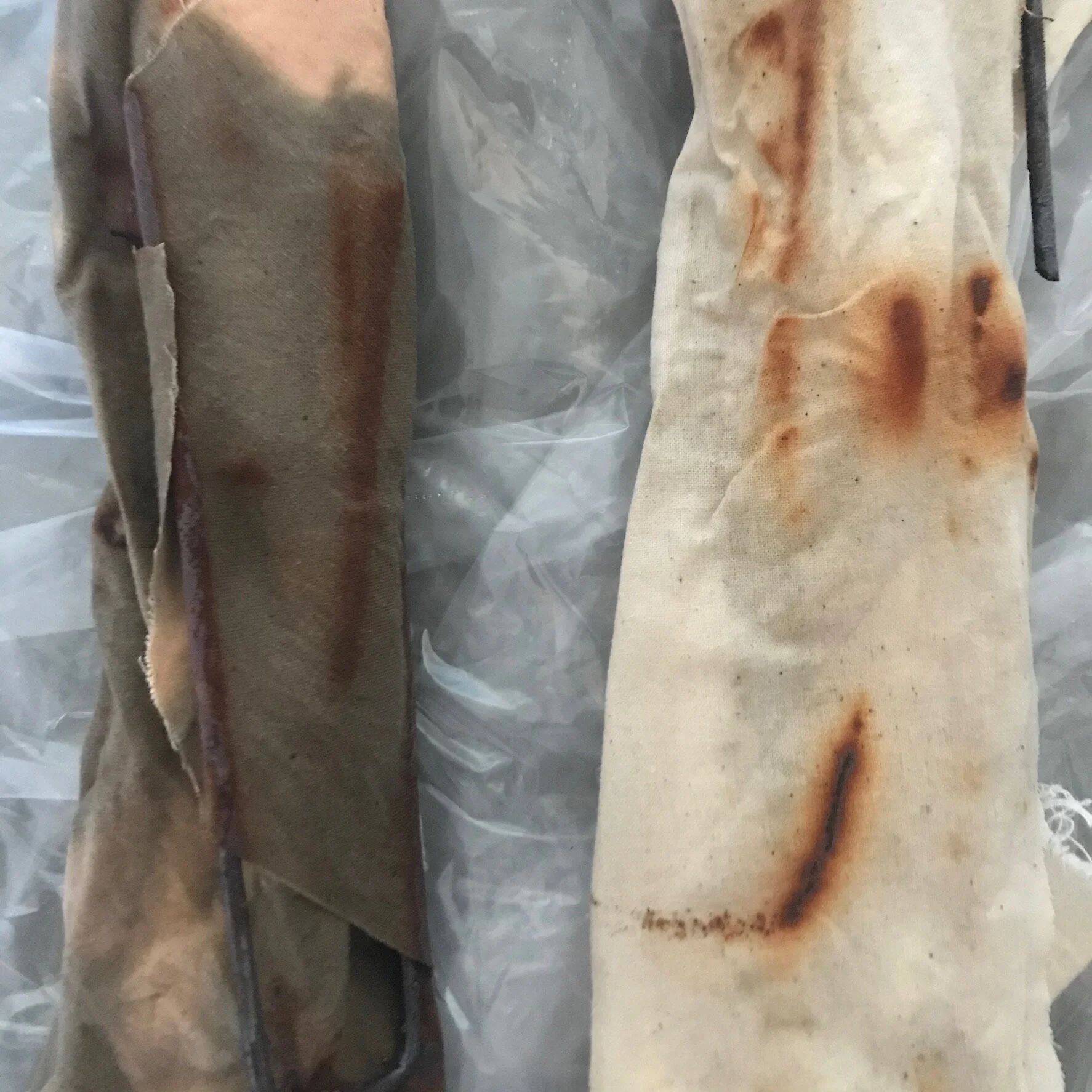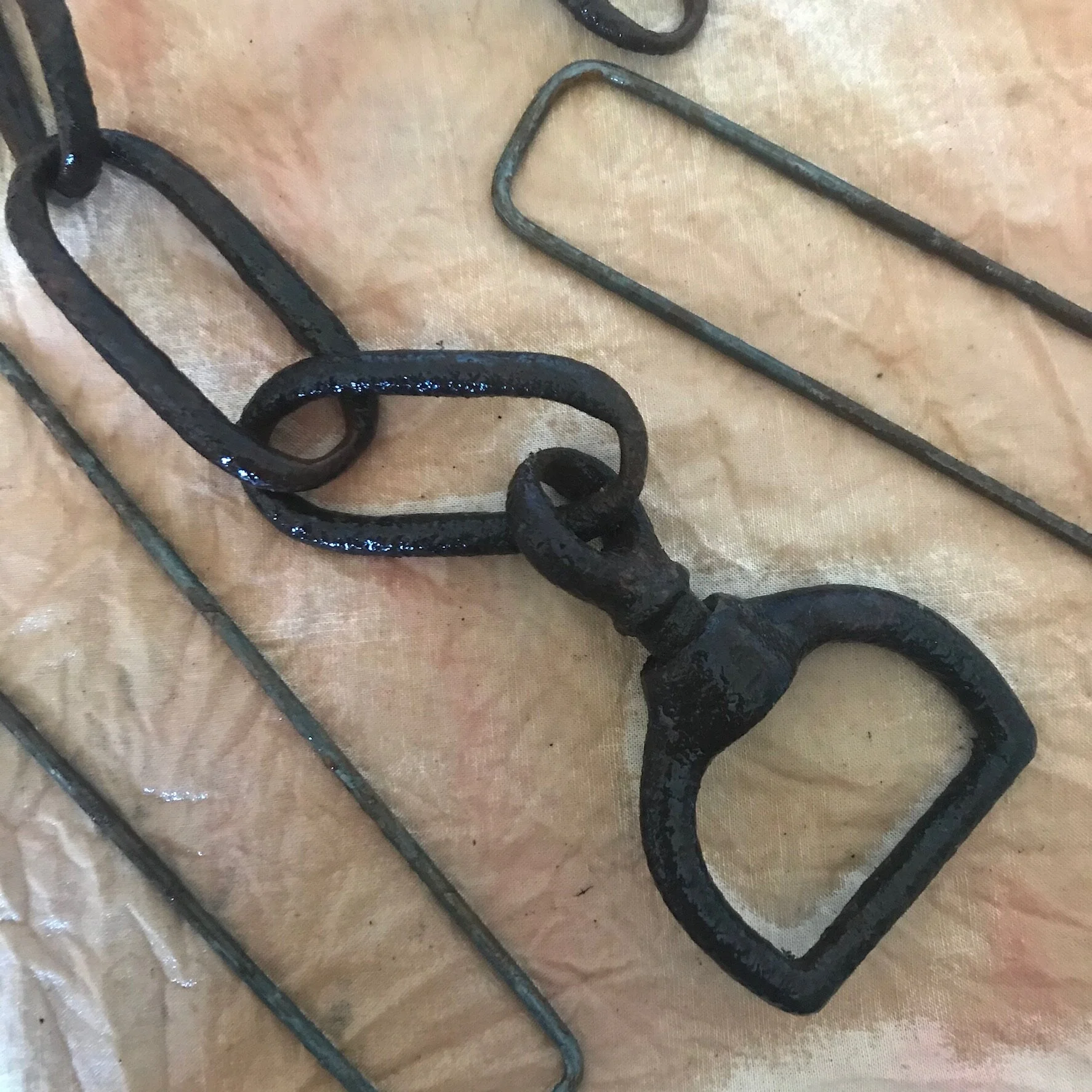 Rusty objects and cotton fabric. The fabric on the left has been dyed using cochineal and onion skins.