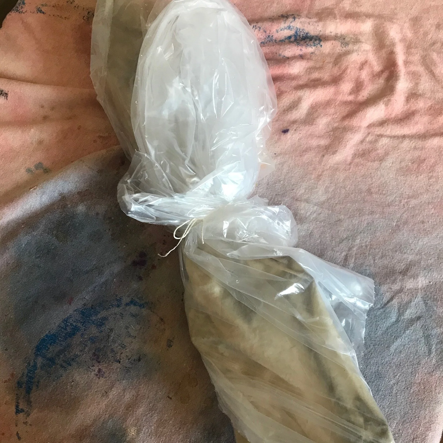 Place you fabric with rusty objects in a plastic bag or cover with a tarp and give one last vinegar water spray. Wrap the bag up, not so much that no air can get in, but so that the vinegar water doesn’t dry up.