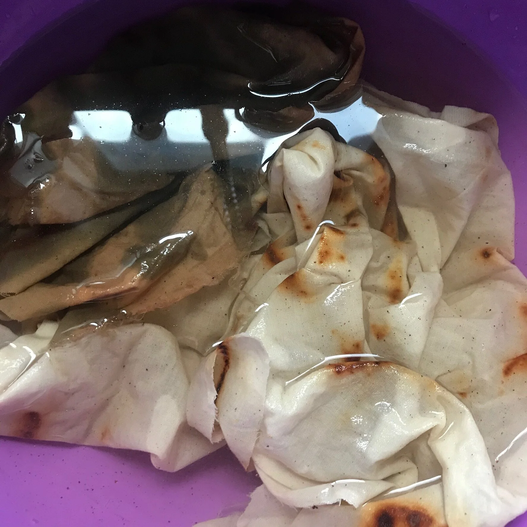 Rust dyed fabric soaking in a baking soda and water solution. Wear gloves if your hands are sensitive to chemicals.