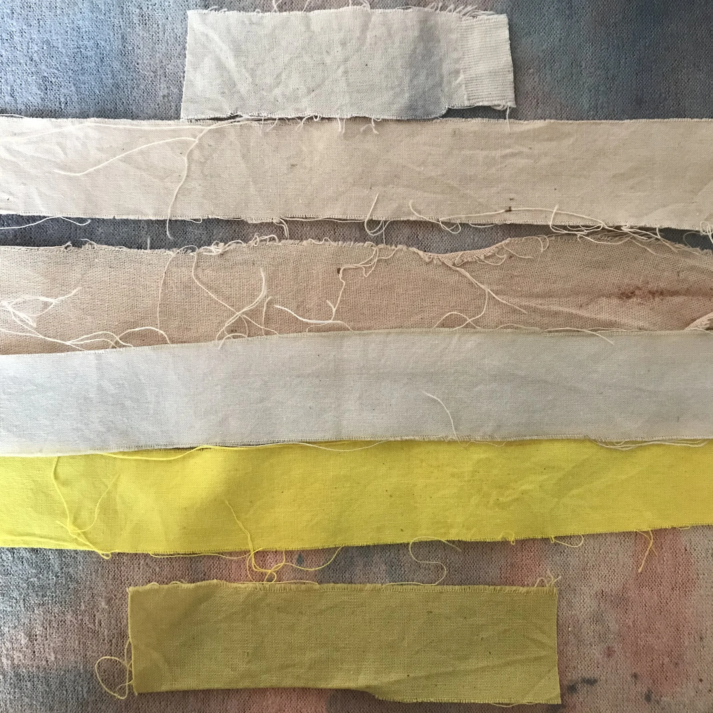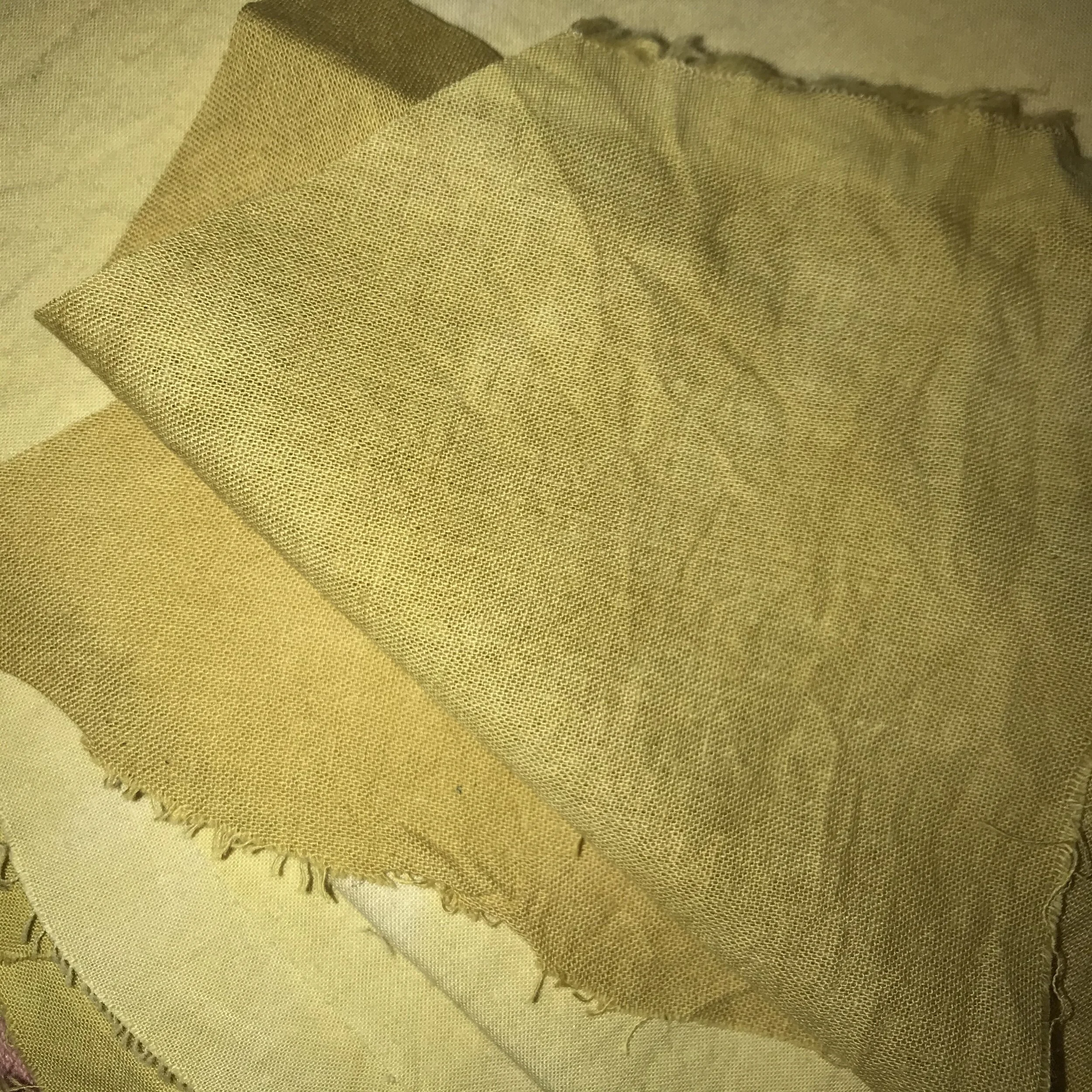 Bundle dyed fabric. The piece on the right is dyed with turmeric and hibiscus tea. That is the piece we will be modifying.