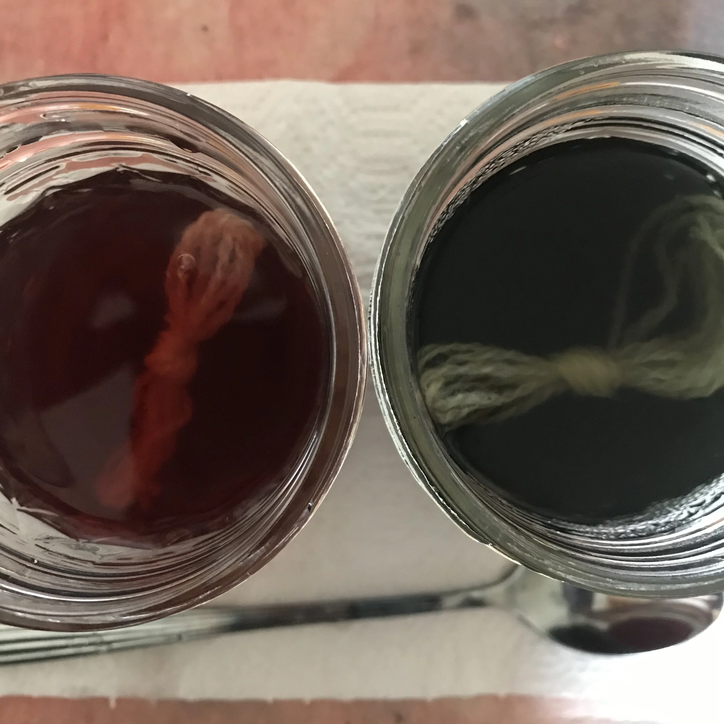 Cochineal dye added to vinegar on the left and baking soda on the right. The yarns are both dyed with cochineal, the top with vinegar and the bottom with baking soda.